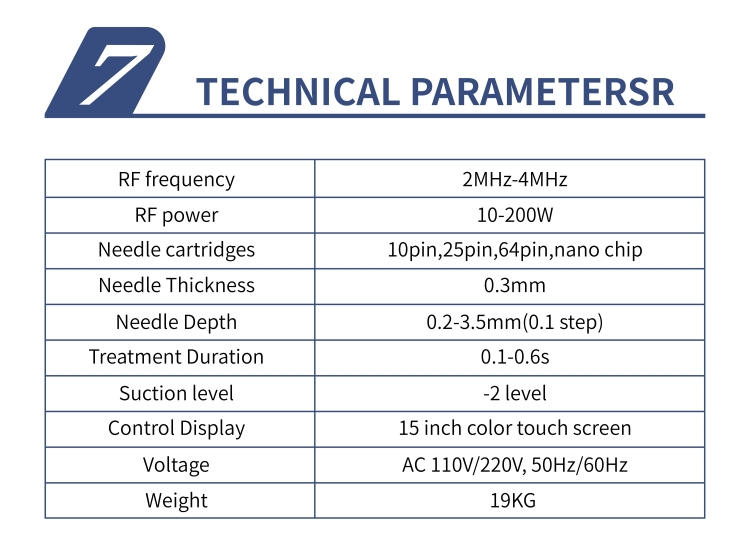 Fractional RF Microneedle System through the special design of many fractional needlepoint arrays, the high-speed digital motor controls order through the epidermis and the dermis ac-curate to control the depth of 0.25-3mm, again by the end of the lattice needle release RF, stimulate collagen and elastic tissue, and is the epidermal layer is safe, RF energy can well to penetrate to the dermis, stimulate collagen protein hyperplasia, not only is the best way to improve the scars, but also long-term tightening skin wrinkles induced.
